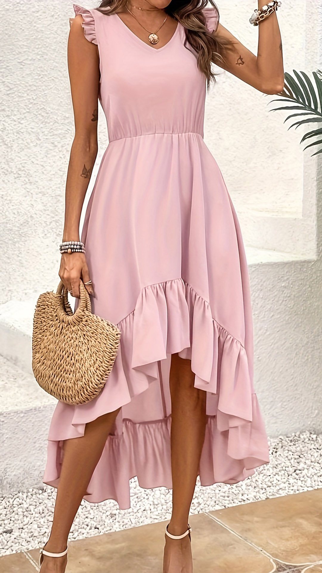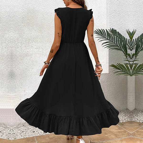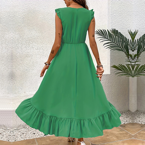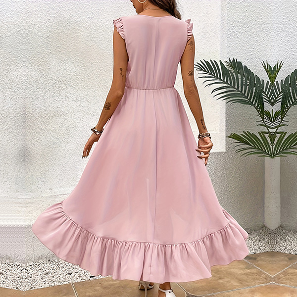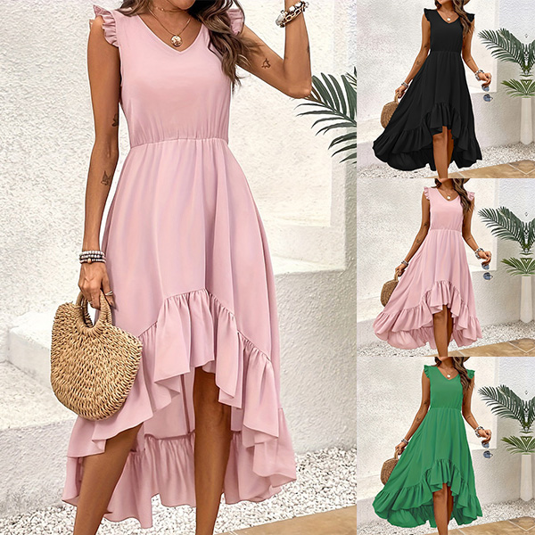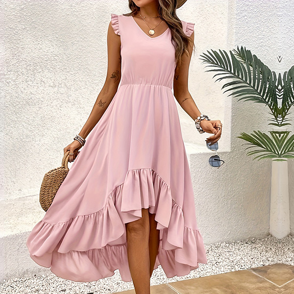 This is a stylish and feminine dress that combines a V-neckline, sleeveless with ruffle detailing and an irregular hemline for a fashionable and eye-catching look. It is perfect for both casual and dressy occasions.