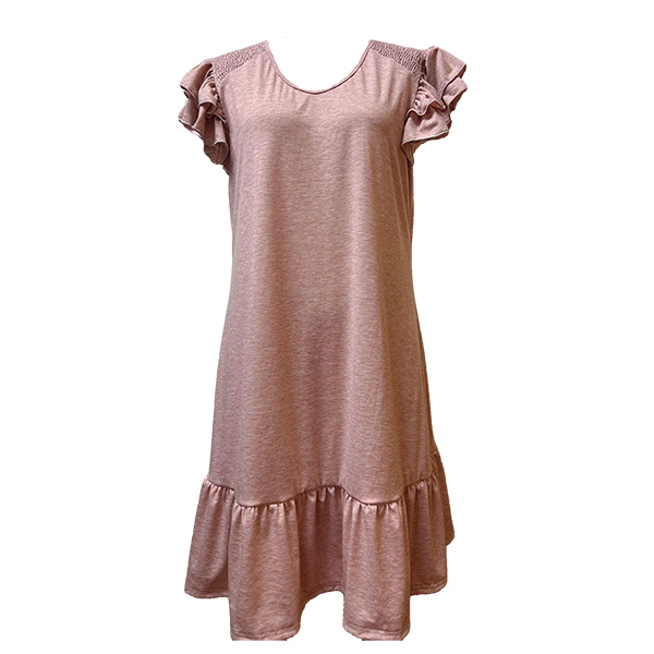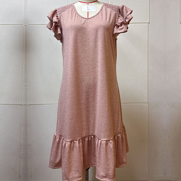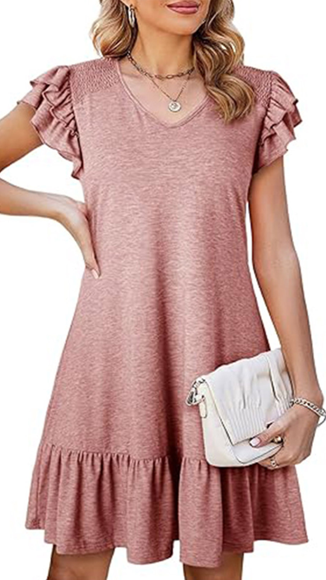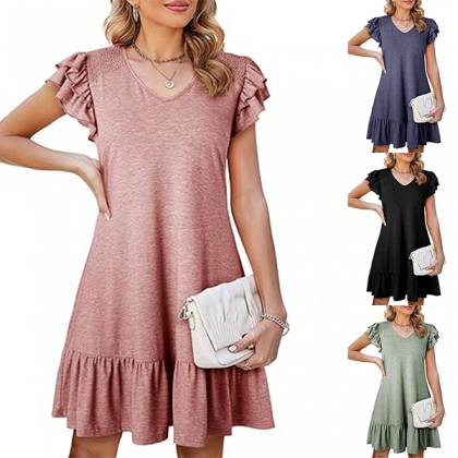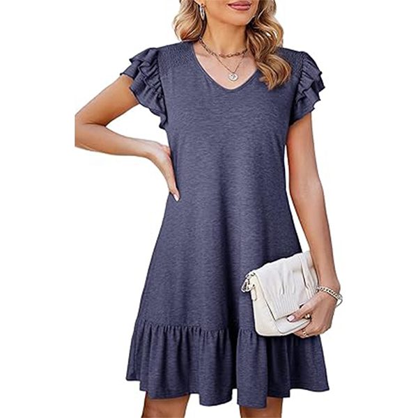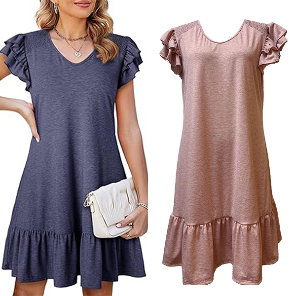 Look at this dress. The flattering V-neckline enhances your silhouette, while the ruffle details along the sleeveless and hemline add a touch of femininity and movement. Perfect for summer wear.