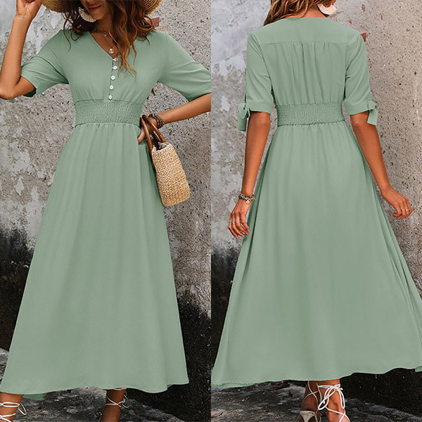 Crafted with high-quality fabric, this midi dress offers both comfort and style. The fabric drapes beautifully on the body, creating a sleek and elegant silhouette. It features a V-neckline, short sleeves, and a smocked cinched waist for a fashionable and flattering look.