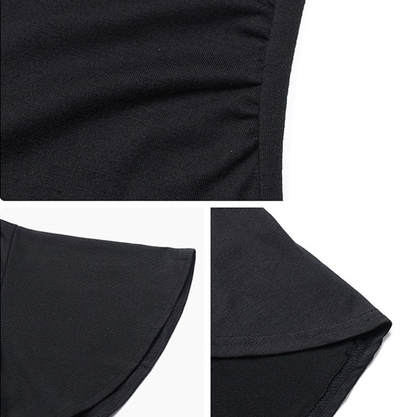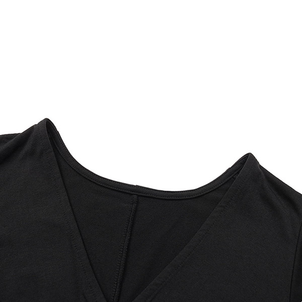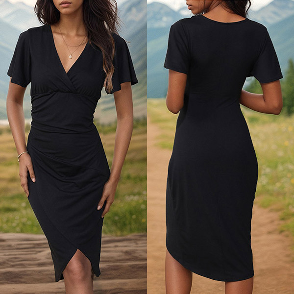 This black dress features a classic V-neckline, short sleeves, and an irregular hemline for a modern and sophisticated look.
