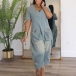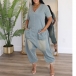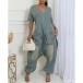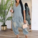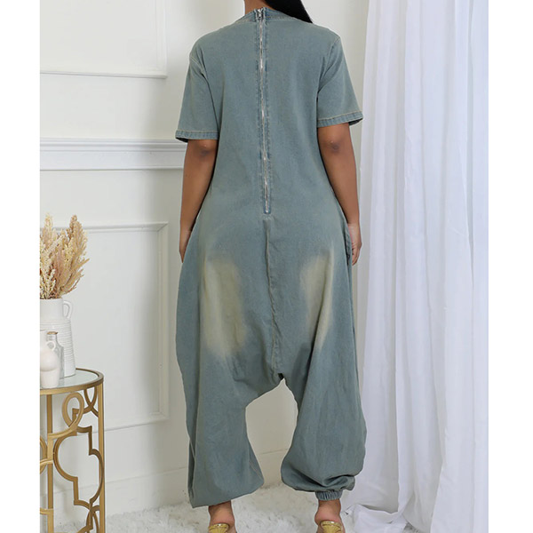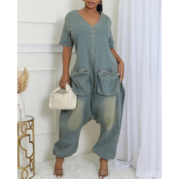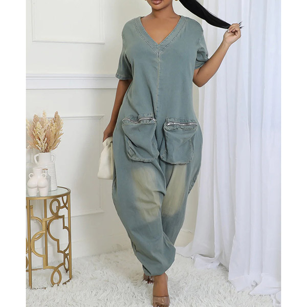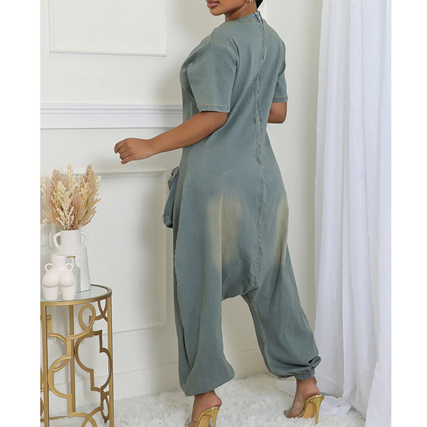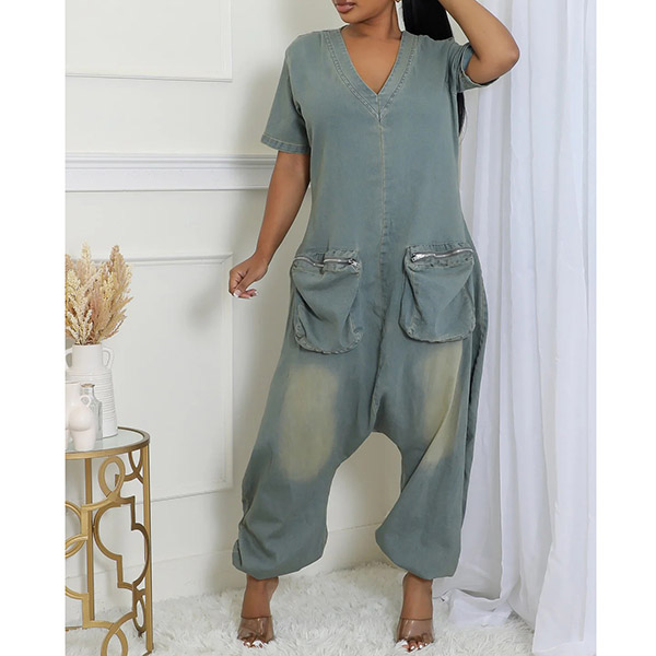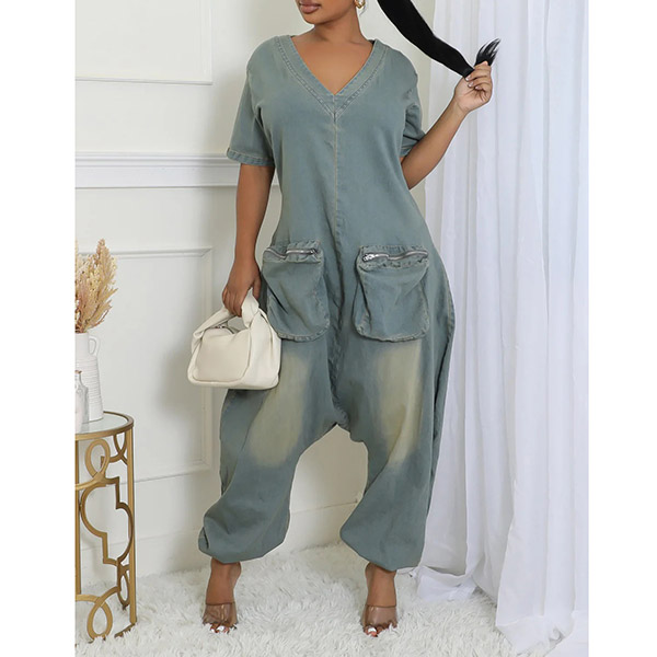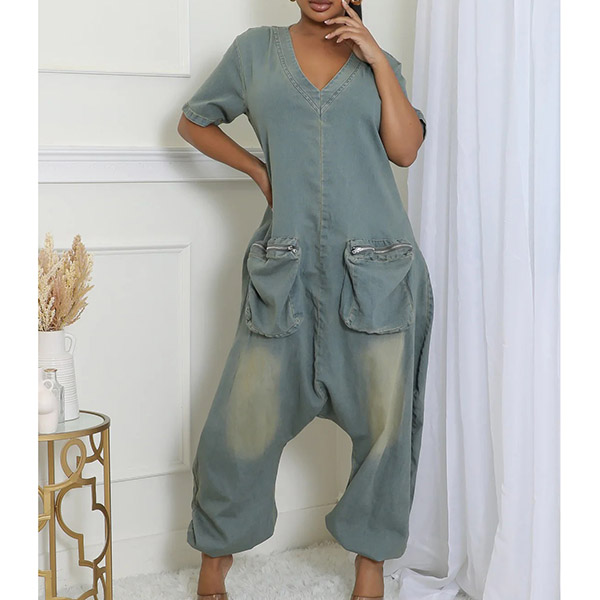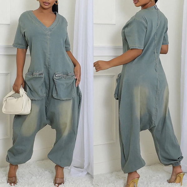 Fashion V-neck Short Sleeve Patch Pockets Loose Old-washed Denim Jumpsuit