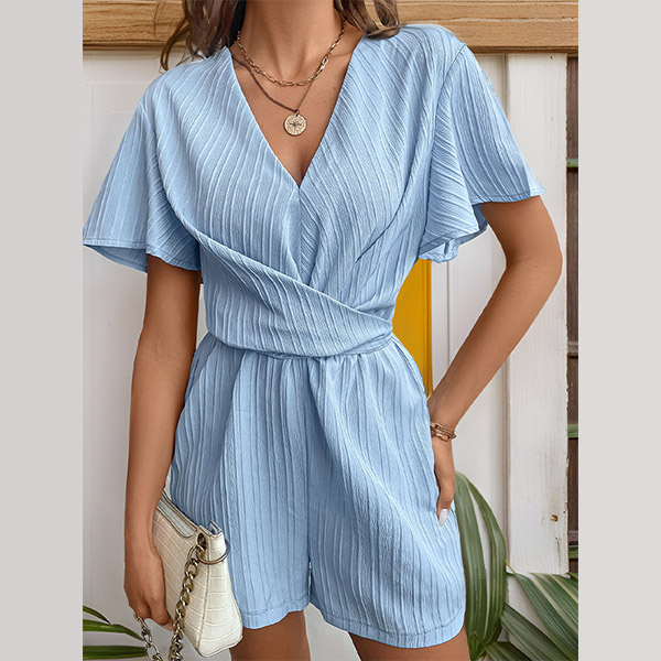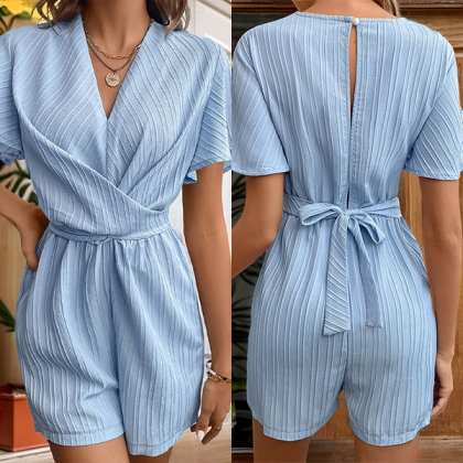 This stylish V-neck romper with short sleeves, V-neck, front ruched detailing, and a self-tie waist, pair with a sandals for a laid-back look.