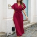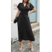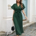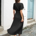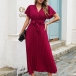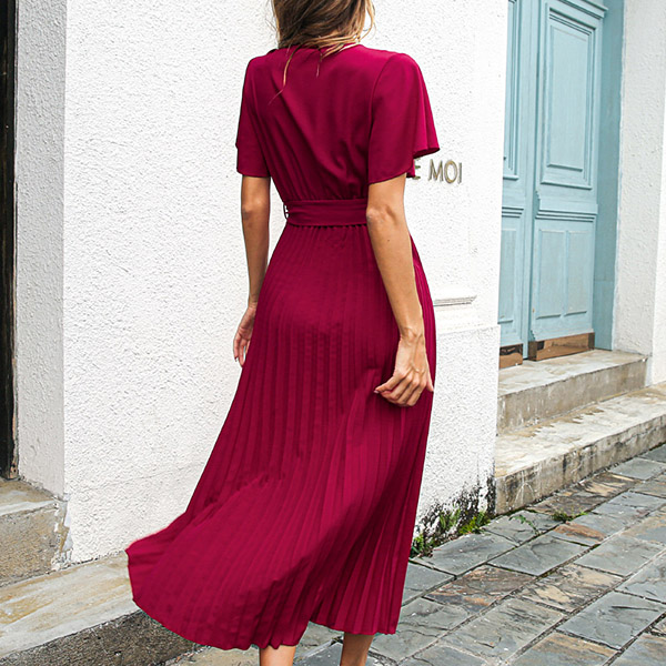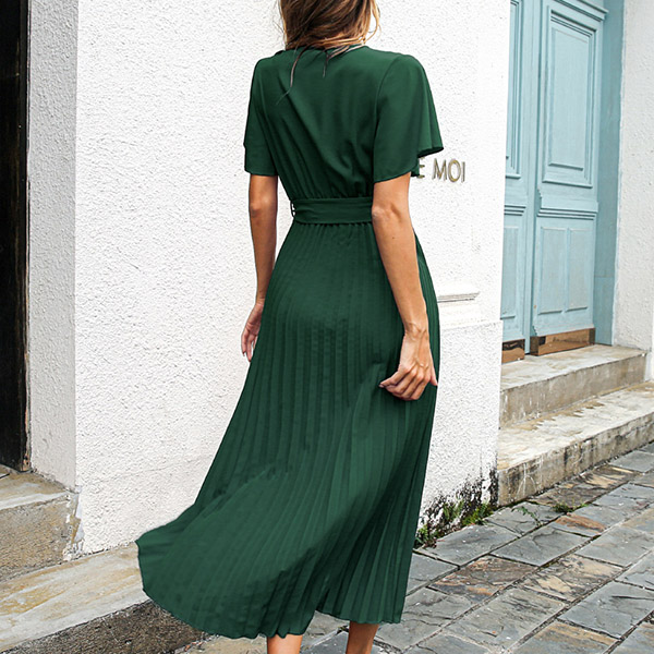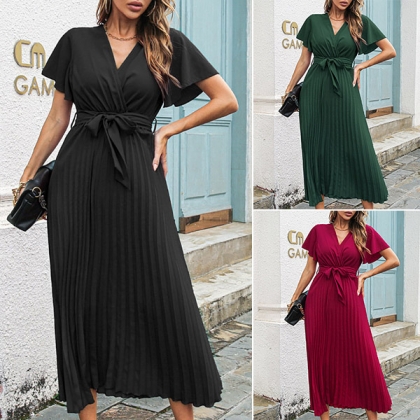Fashion V-neck Short Sleeve Self-tie Pleated Dress
