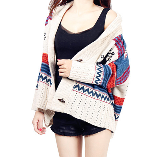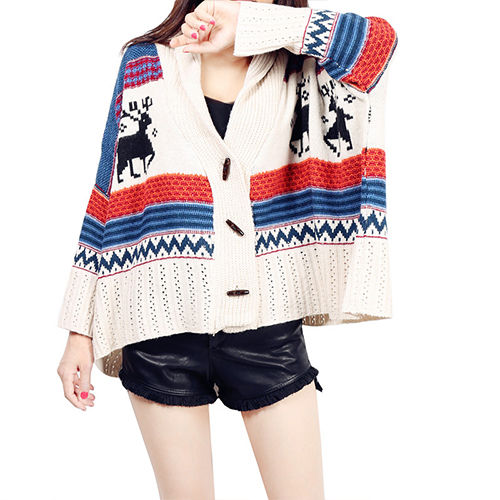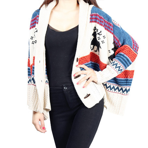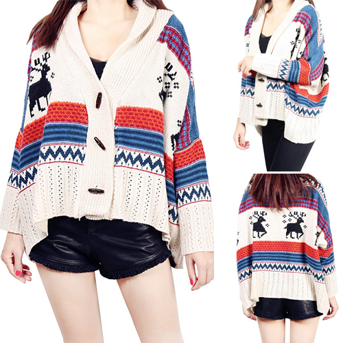 Fashion V-neck Single-breasted Striped/Reindeer Printed Bat Sleeve Sweater Cardigan