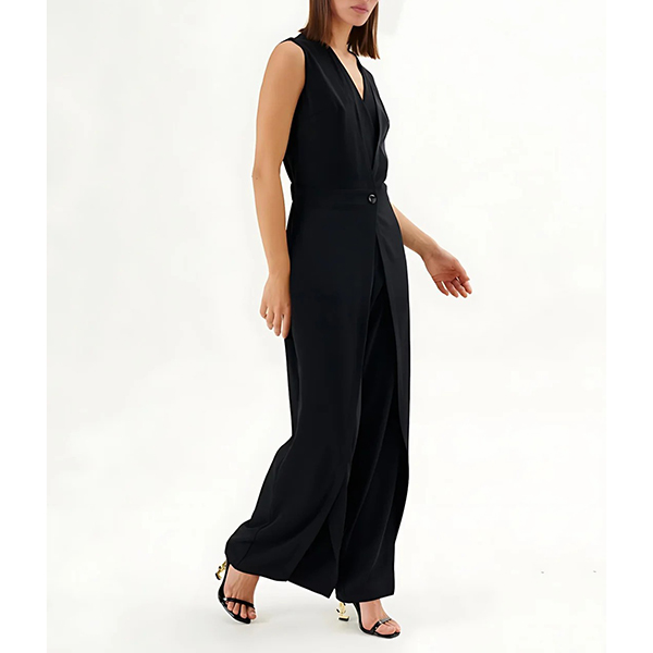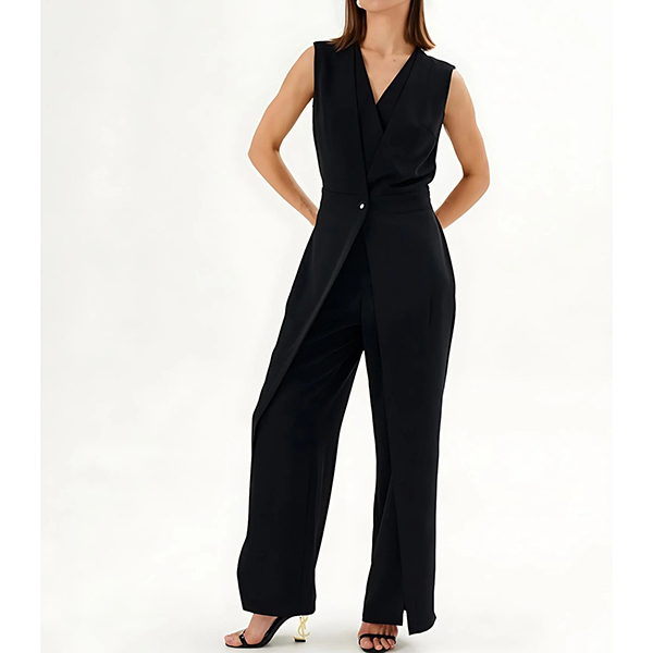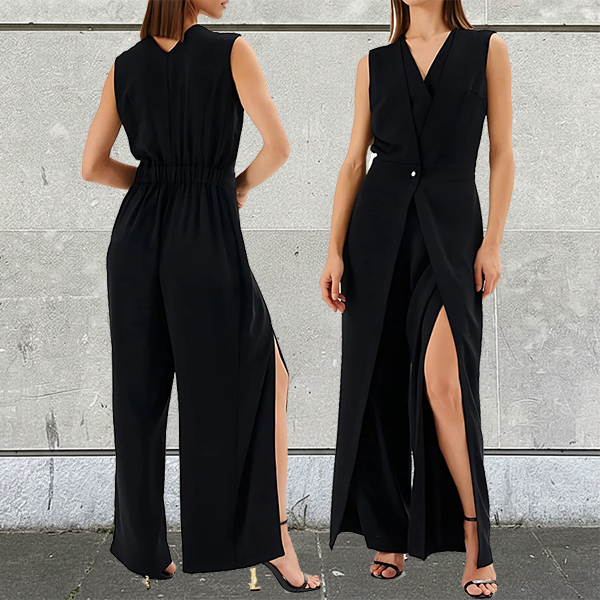 Achieve effortless one-and-done elegance in this streamlined jumpsuit that makes dressing simple without sacrificing style. The flattering V-neckline elongates your frame and adds sophisticated appeal, while the sleeveless design keeps you cool and comfortable. A dramatic front slit creates eye-catching detail and allows graceful movement with every step. Hope you like it.