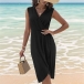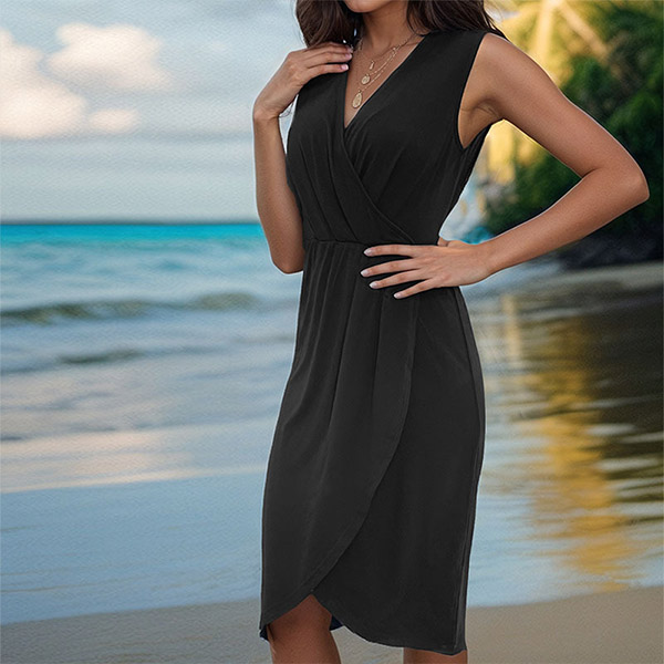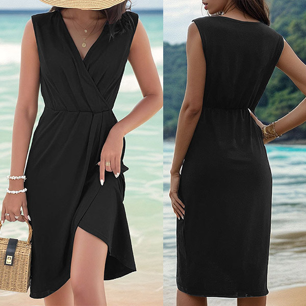 This black dress features a flattering V-neckline, sleeveless design, and a stylish front slit for a chic and versatile look. Black is a versatile and classic color that is universally flattering and easy to style. Wanna have one?