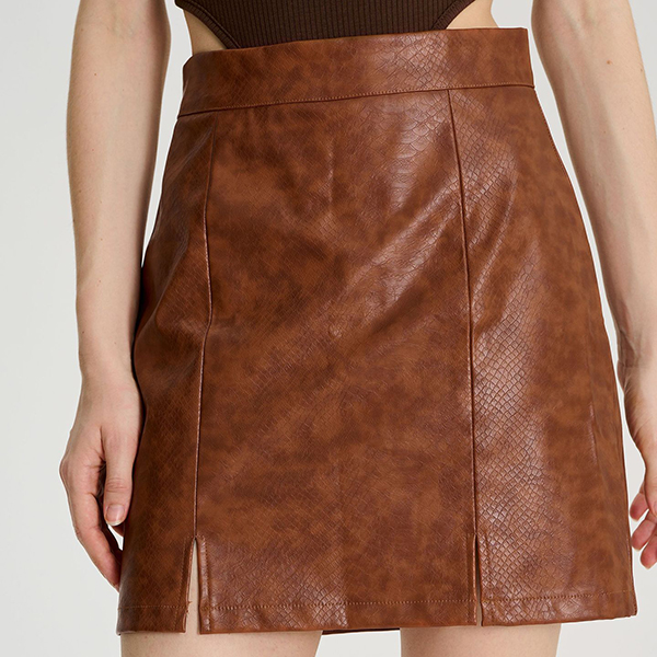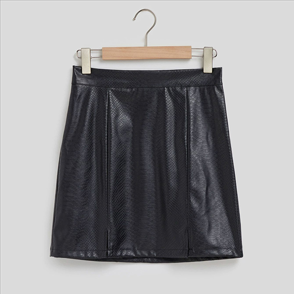 This striking leather-look skirt features a distinctive V-shaped waistline for modern edge. The artificial leather PU material offers luxurious finish whilst remaining affordable and easy to care for. Perfect for daily wear.