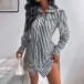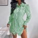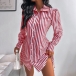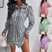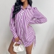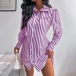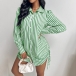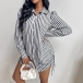 Fashion Vertical Stripe Print Side Drawstring Long Sleeve Shirt Dress