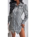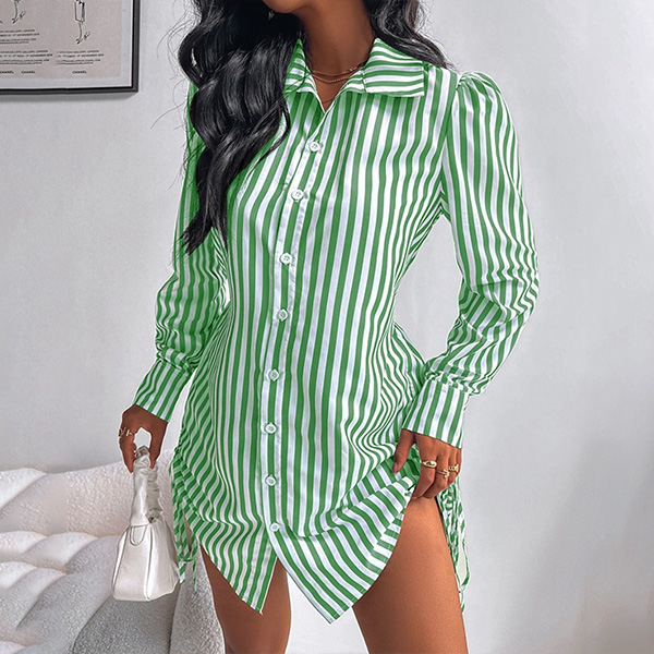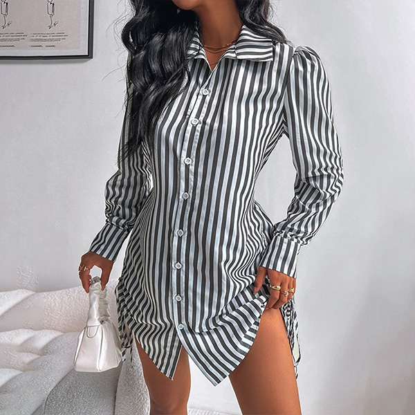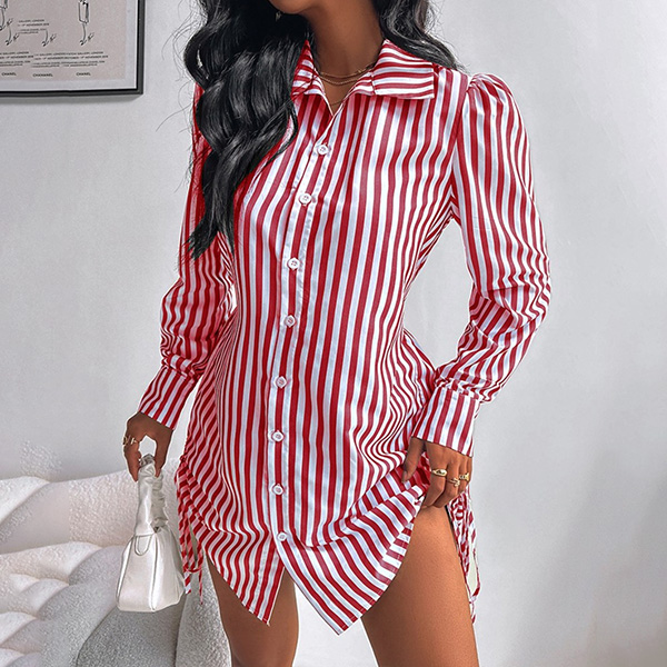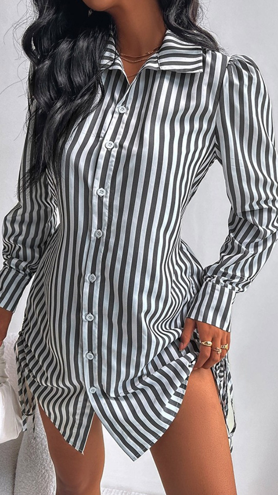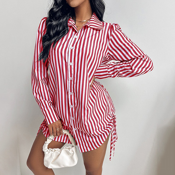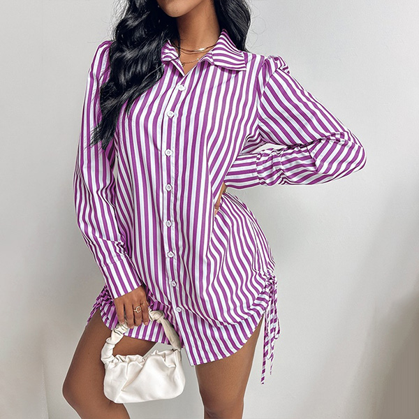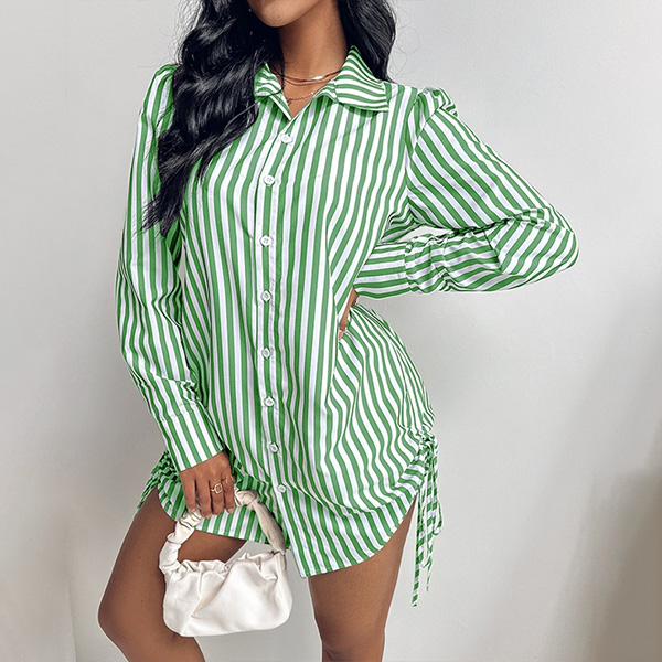 This stylish shirt dress features a vertical stripe print, side drawstring detail, and long sleeves, creating a trendy and chic look. Pair it with sneakers for a more casual vibe.