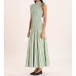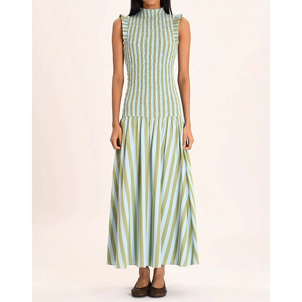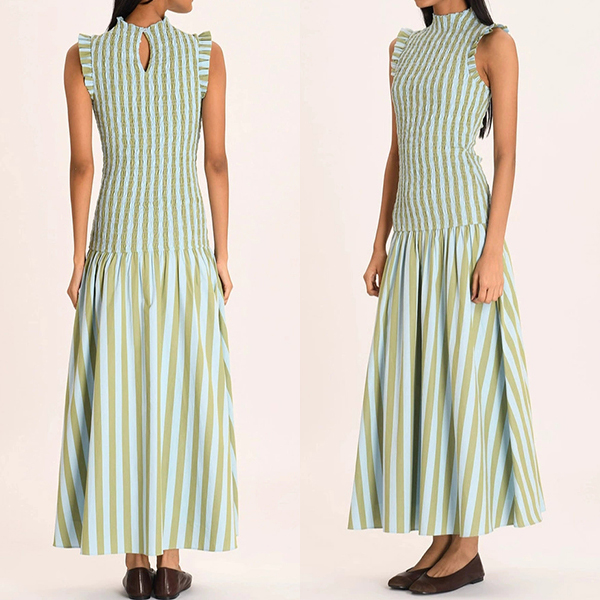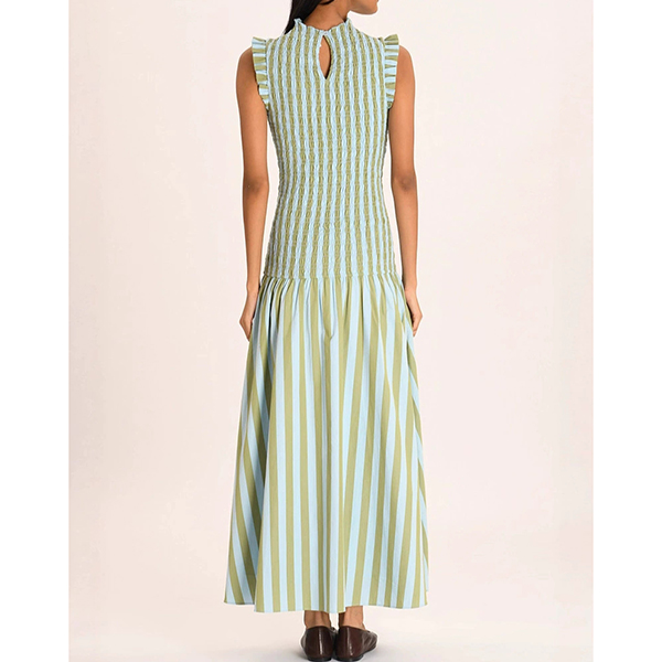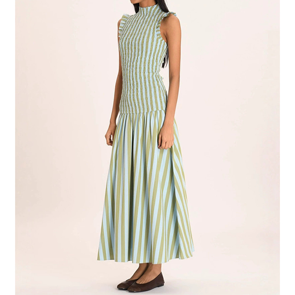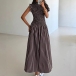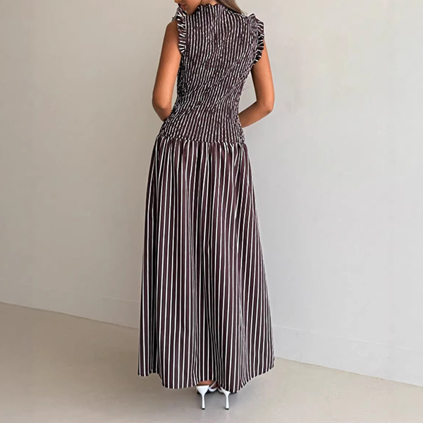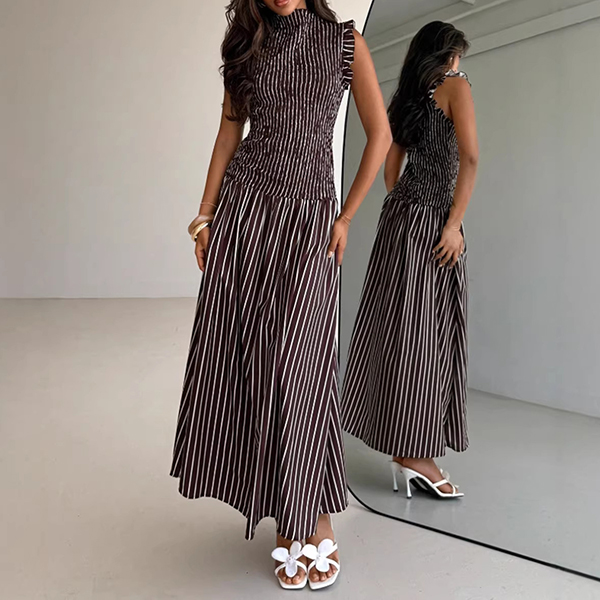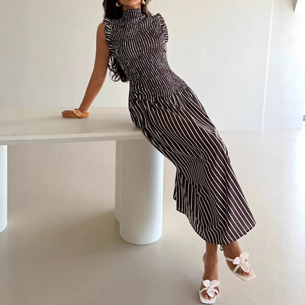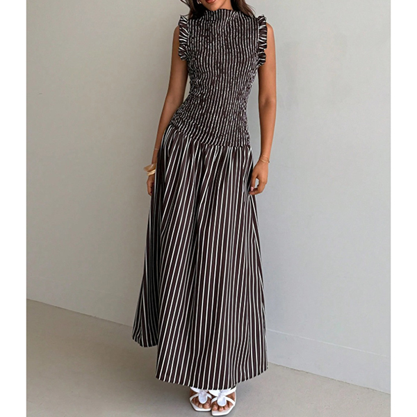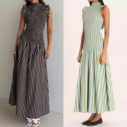 Fashion Vertical Stripe Printed Ruffle Mock Neck Sleeveless Maxi Dress