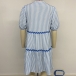 This dress features vertical stripes, a flattering V-neckline, short sleeves, and a tiered silhouette, creating a fashionable and eye-catching look.