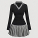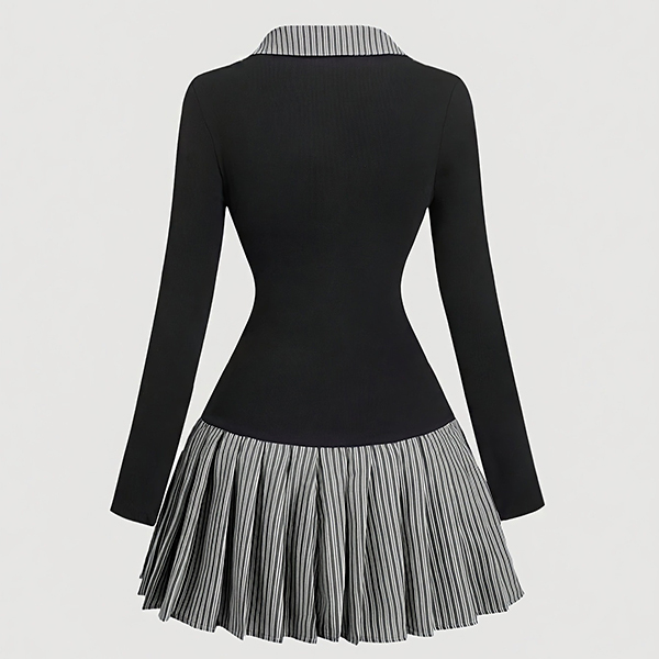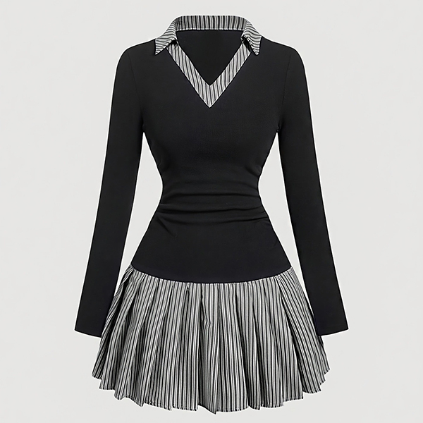 Fashion Vertical Striped Polo Collar V-neck Long Sleeve Mini Dress