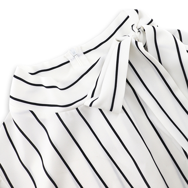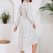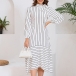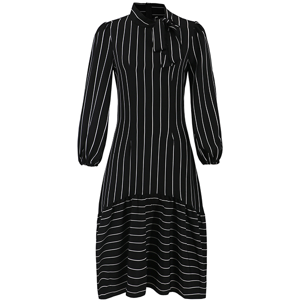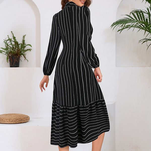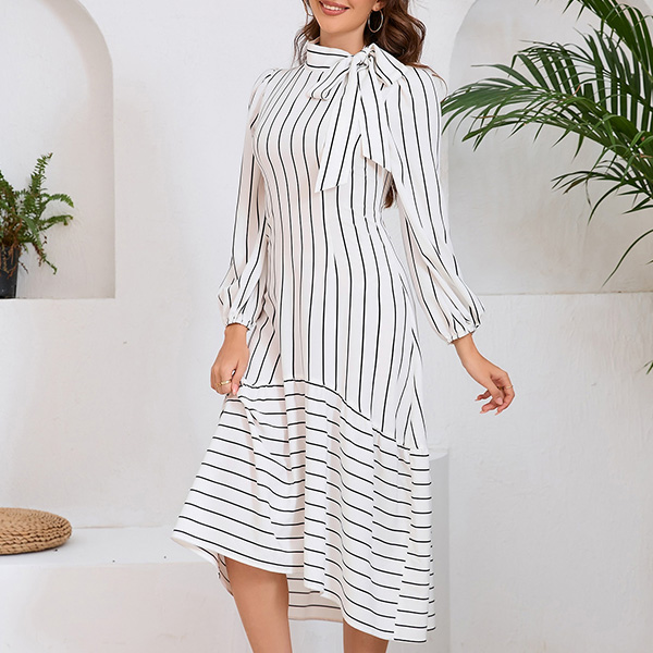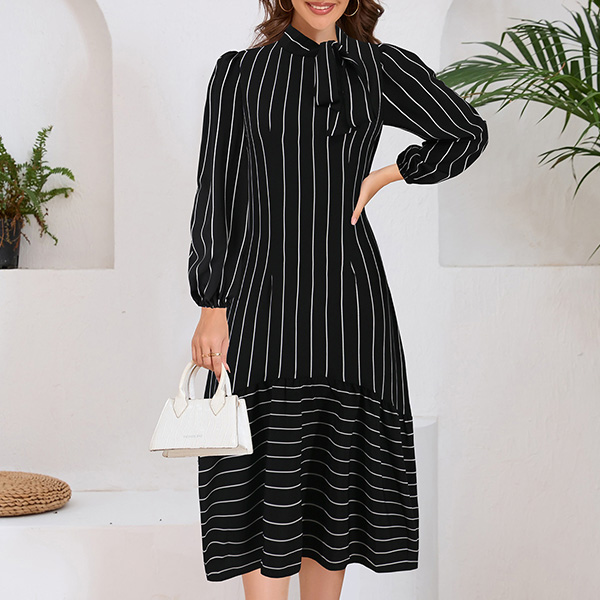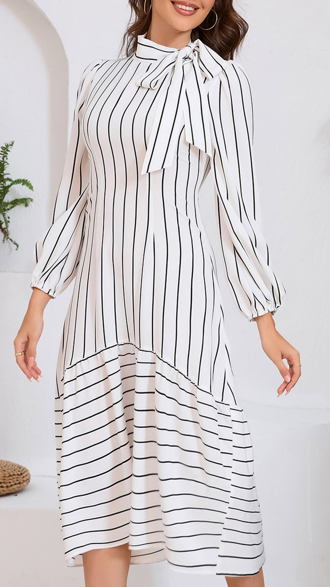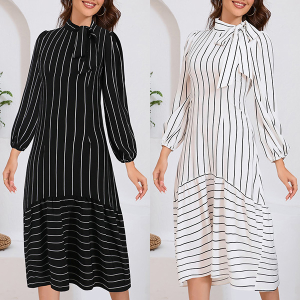 This midi dress features a vertical striped print, a self-tie detail at the crew neck, and long sleeves, creating a chic and stylish look. Color:White,Black, which one do you like?
