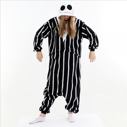 Fashion Vertical Striped Skull Hooded Plush Pajamas Jumpsuit