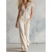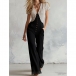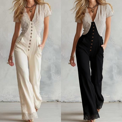 Fashion Vertical Striped Spliced V-neck Short Sleeve Front Button Wide-leg Jumpsuit