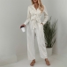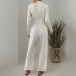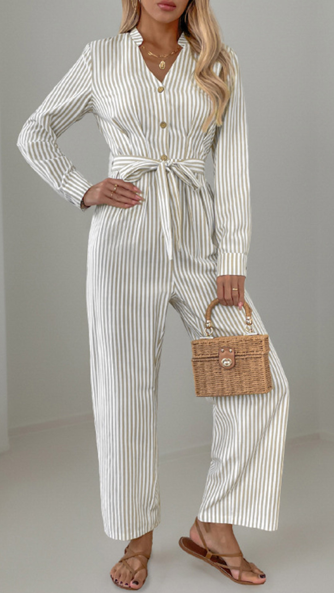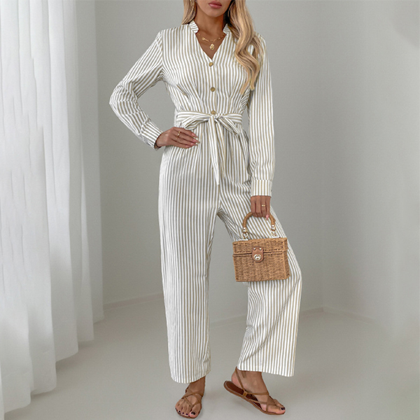 Fashion Verticial Stripe Printed Button V-neck Straight-cut Self-tie Jumpsuit