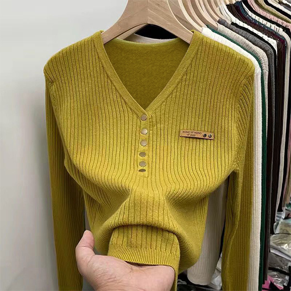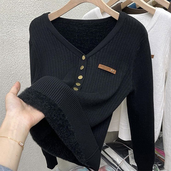 Chemise chaude à manches longues et col en V doublée en peluche, style côtelé et boutonnée.