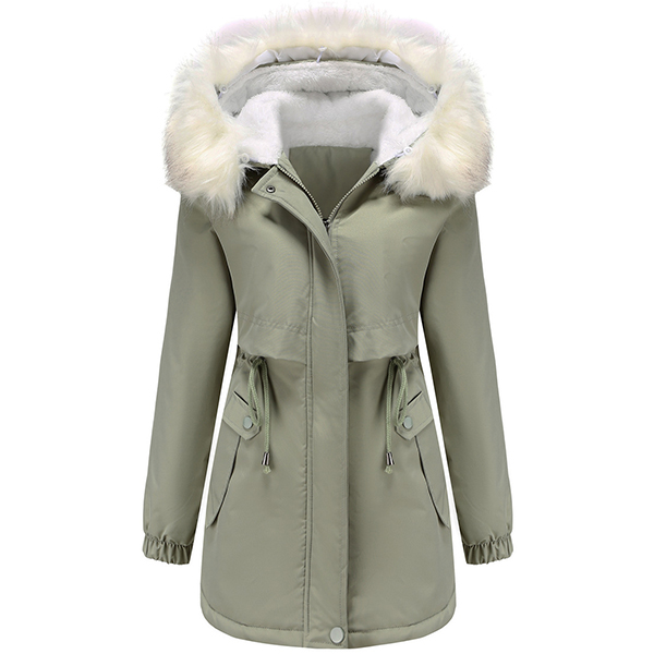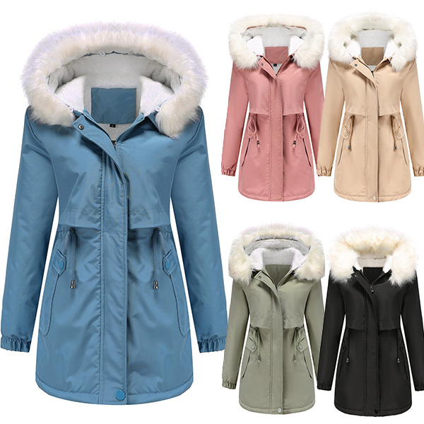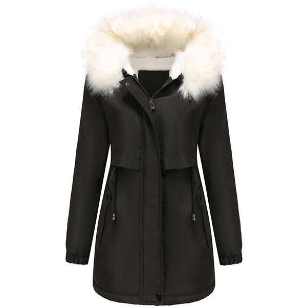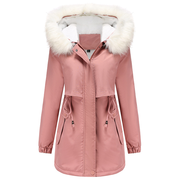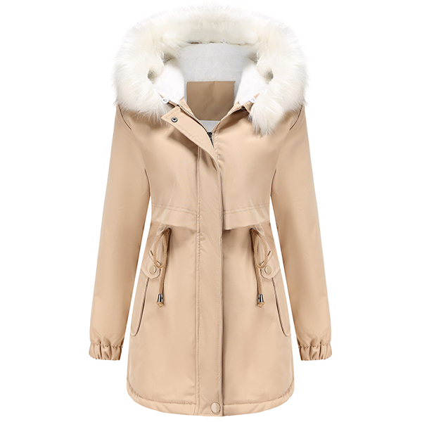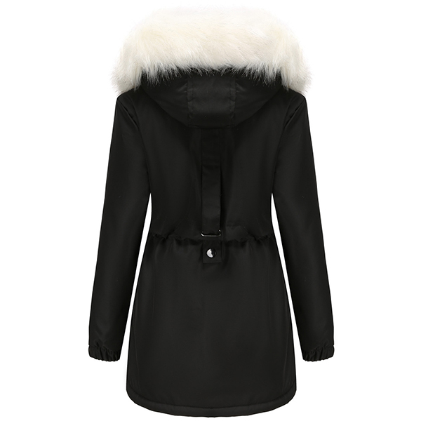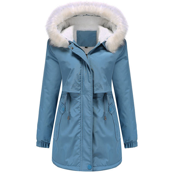 Fashion Warm Solid Color Long Sleeve Drawstring Waist Plush Lined Artificial Fur Spliced Hooded Jacket