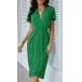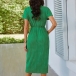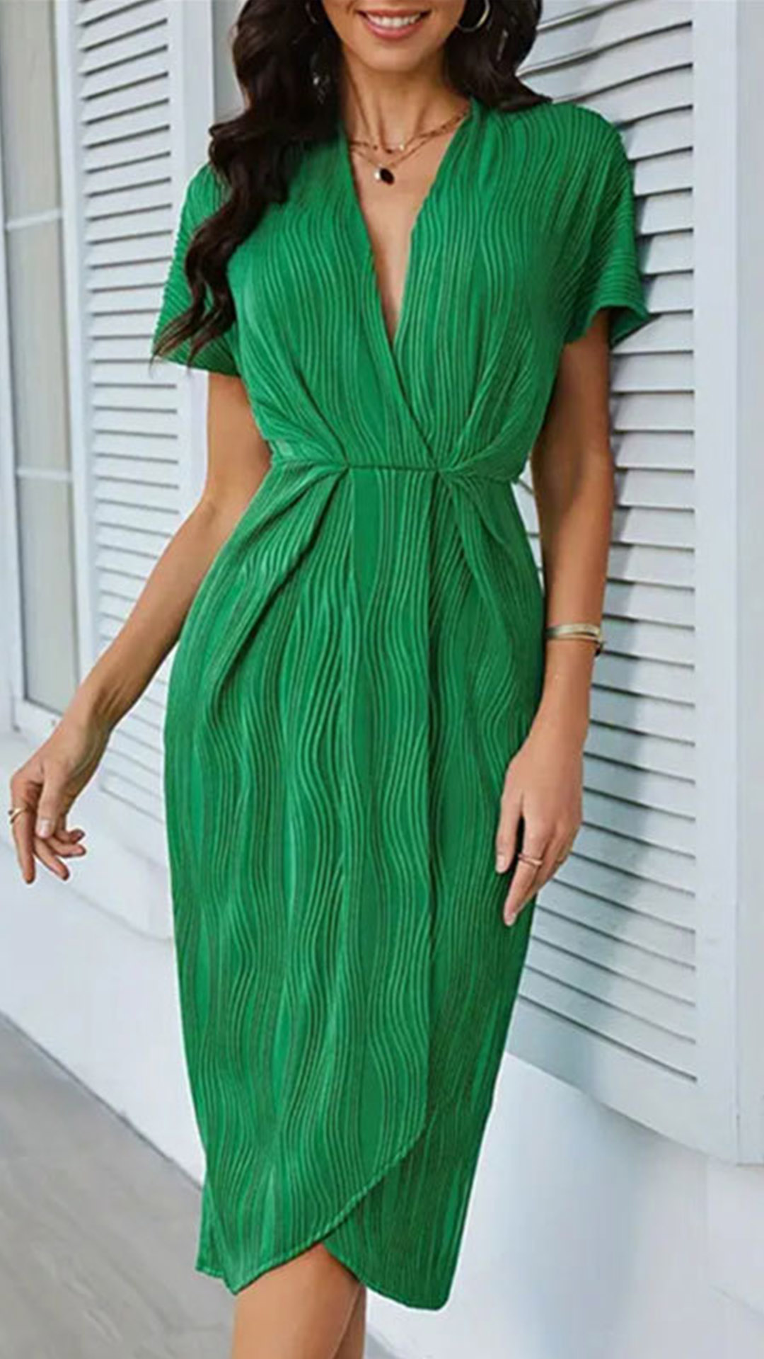 This green dress features a bold wave pattern, a flattering V-neckline, short sleeves, and an asymmetrical hemline, creating a striking and fashion-forward silhouette. For a casual, daytime look, pair the dress with flat sandals or sneakers and a denim jacket or lightweight cardigan.