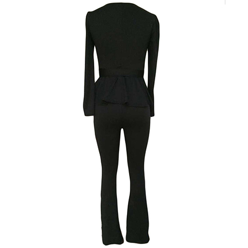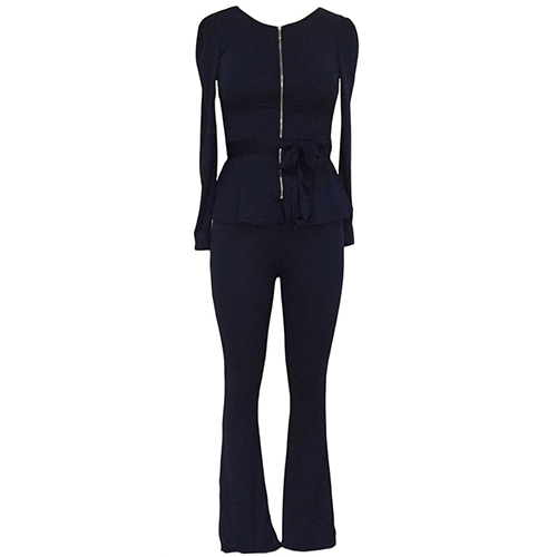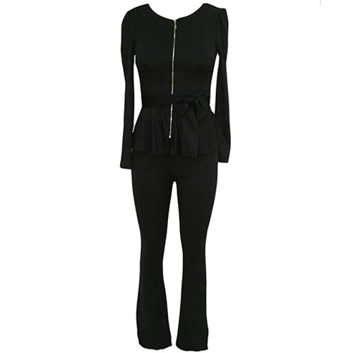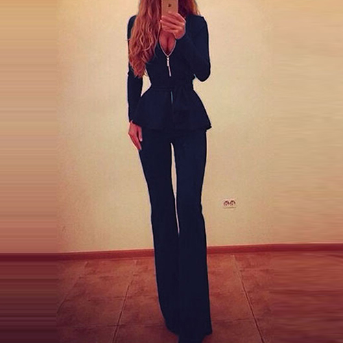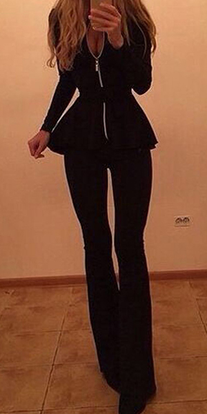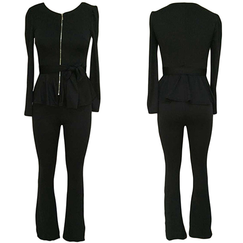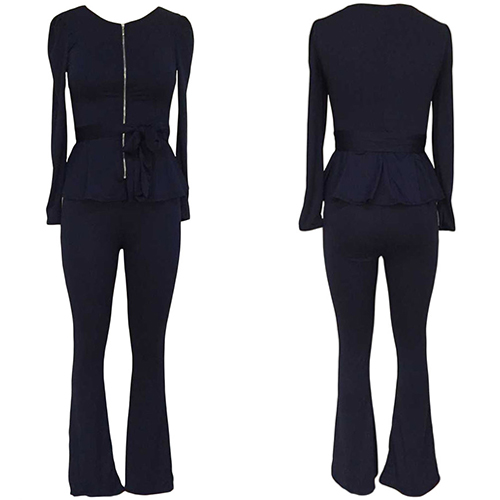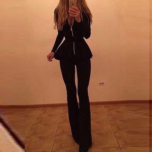 zipper in front, and gathered waist with waistband, along with flared pants. A fashion-up presence and