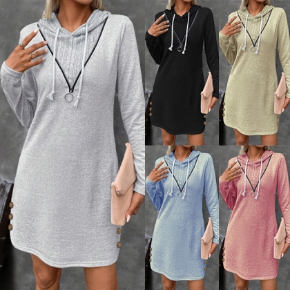 Featuring a front zipper and side buttoned design, this dress offers a unique and edgy look. The drawstring hood adds a touch of sporty chic, giving it a modern and fashionable twist. Wanna have a try?