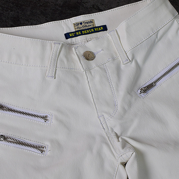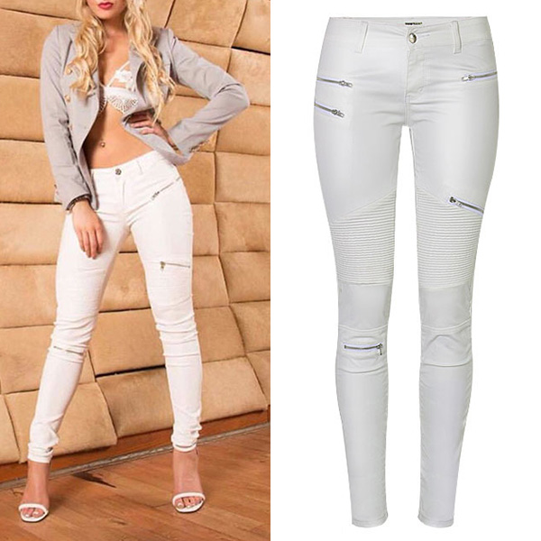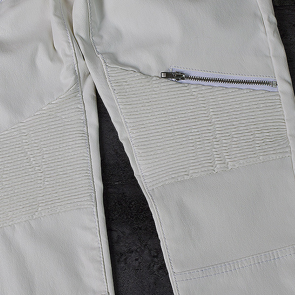 Unleash your edgy and fashion-forward style with this White Artificial Leather PU Skinny Pants. These pants feature a sleek and form-fitting silhouette, ruched detailing, a faux leather (PU) fabric, and zipper accents, creating a bold and statement-making look. Pair these fashion zipper ruched artificial leather PU skinny pants with a graphic t-shirt, a cropped top, or a blouse for a stylish and daring ensemble.