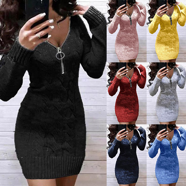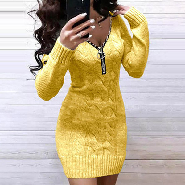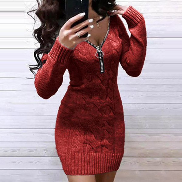 Fashion Zipper V-neck Long Sleeve Solid Color Slim Fit Knit Sweater Dress