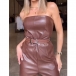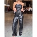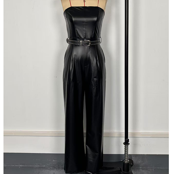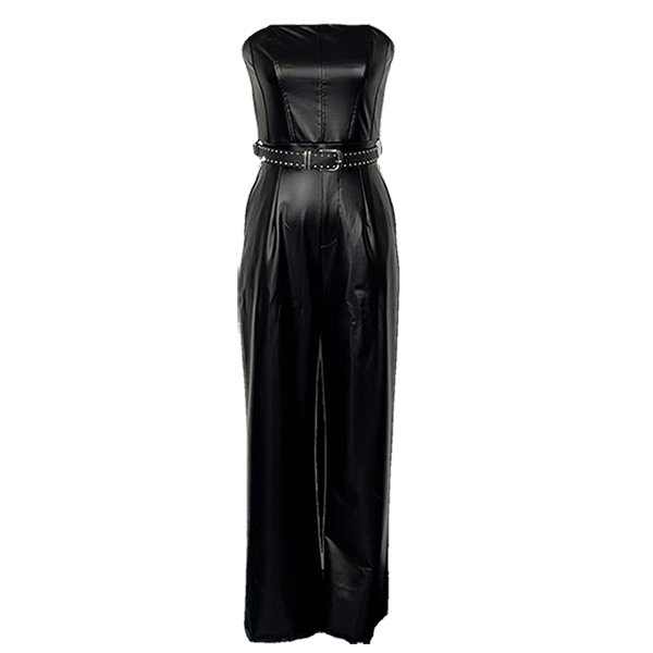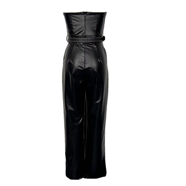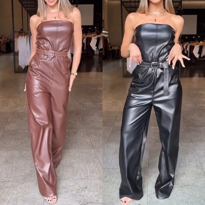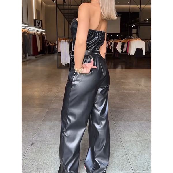 Faux Leather Jumpsuit with Tube Top Design, Belted Waist and Straight Leg Cut