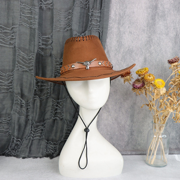 Faux Suede Cowboy Hat: The centerpiece of the look. Features a rich brown tone with stitched brim details and a rugged hatband.