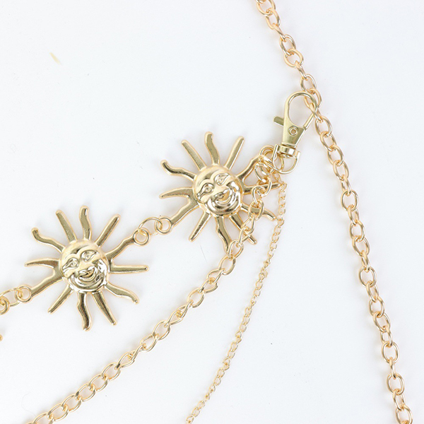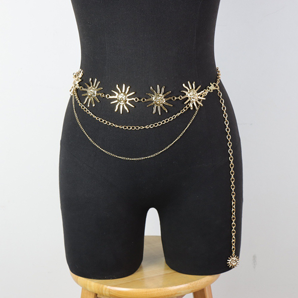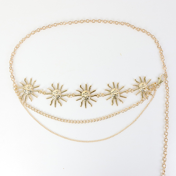 Celestial Sun Chain Belt: Elevate your waistline with this stunning gold-tone chain belt featuring radiant sun charms. It drapes perfectly over shorts or skirts.