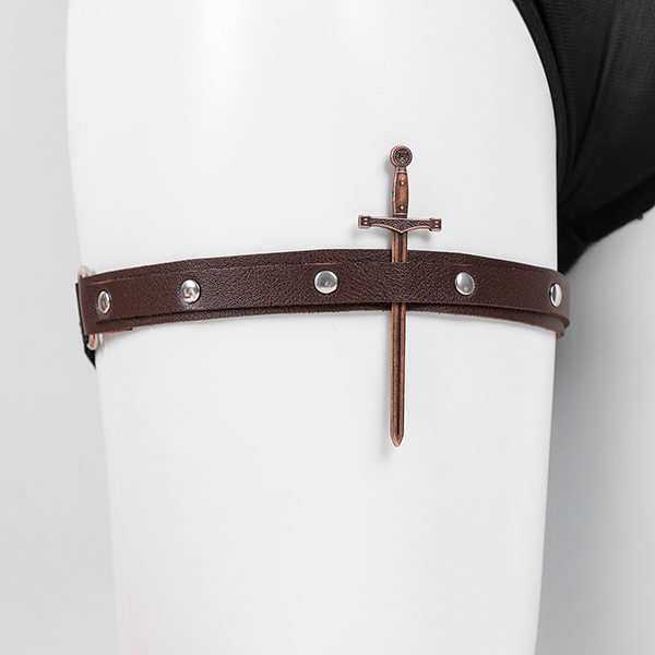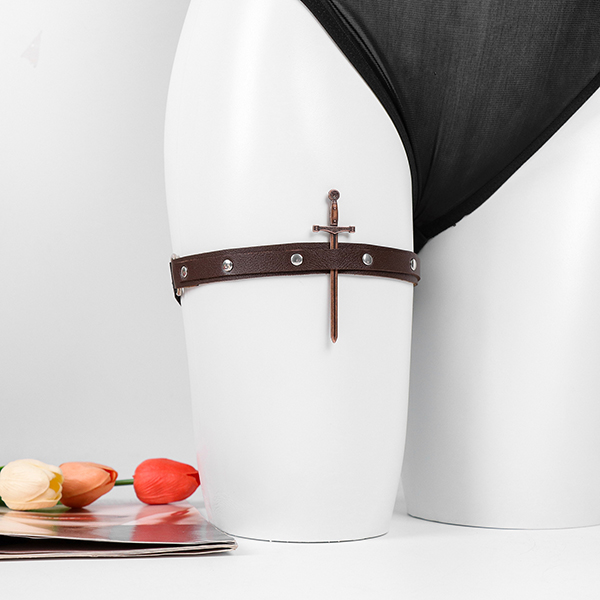 Edgy Thigh Garter: The cherry on top. A faux leather leg garter featuring a unique dagger charm to add a touch of danger to your outfit.