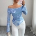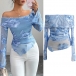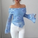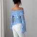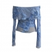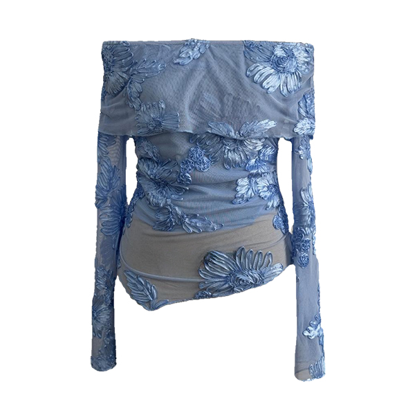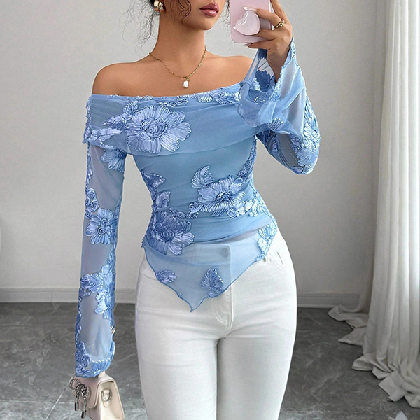 Flared Sleeve Top with Boat Neckline and Asymmetrical Hem Embroidered Design