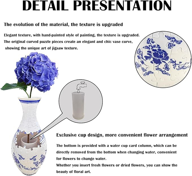 2. CLEVER DESIGN WITH PRACTICAL FUNCTIONALITY: Features a unique internal water reservoir that allows you to add water for fresh flowers without damaging the puzzle structure. The classic blue and white floral design complements any décor style.