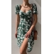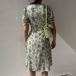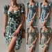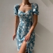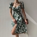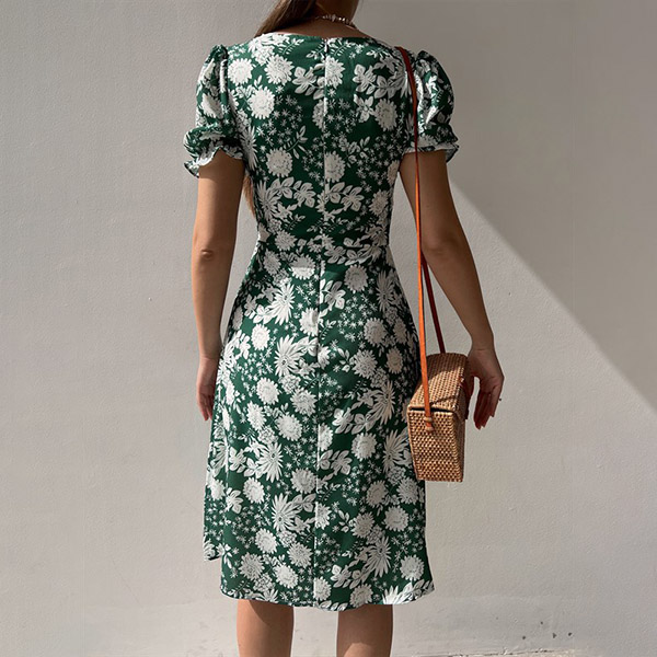 France Style Sweetheart Neck Peasant Sleeve Buttoned Floral Printed Dress