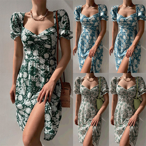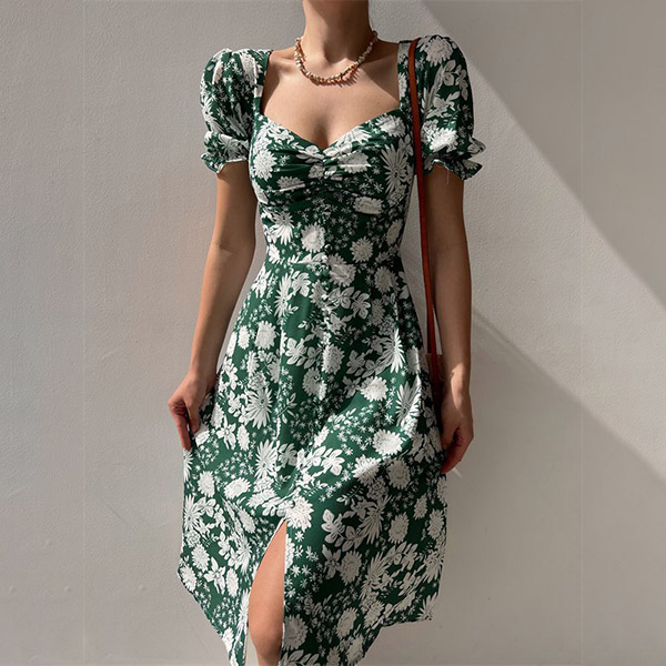 This France-style dress features a sweetheart neckline, peasant sleeves, and a buttoned front. The floral print is perfect for spring and summer.