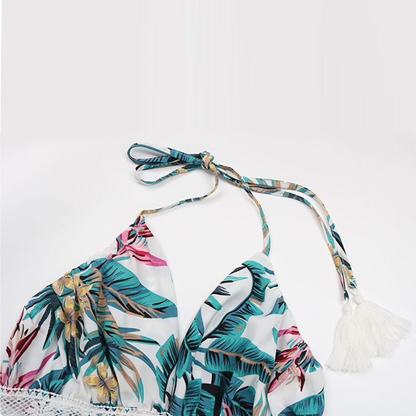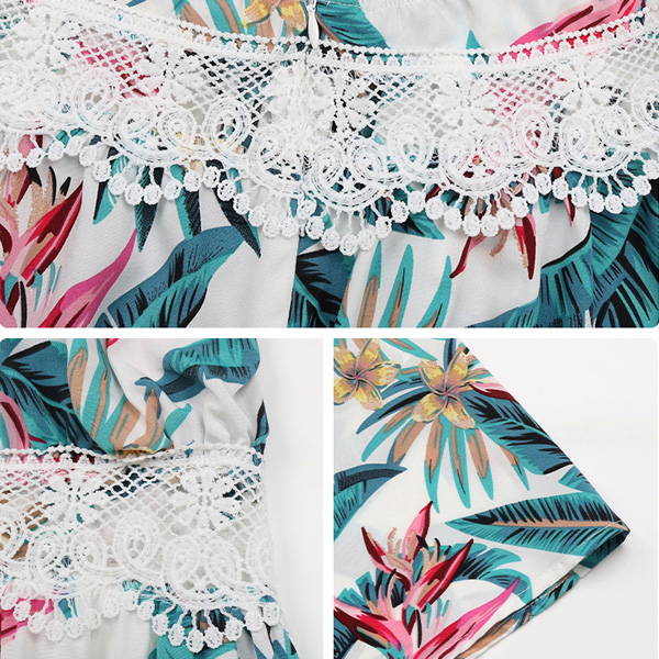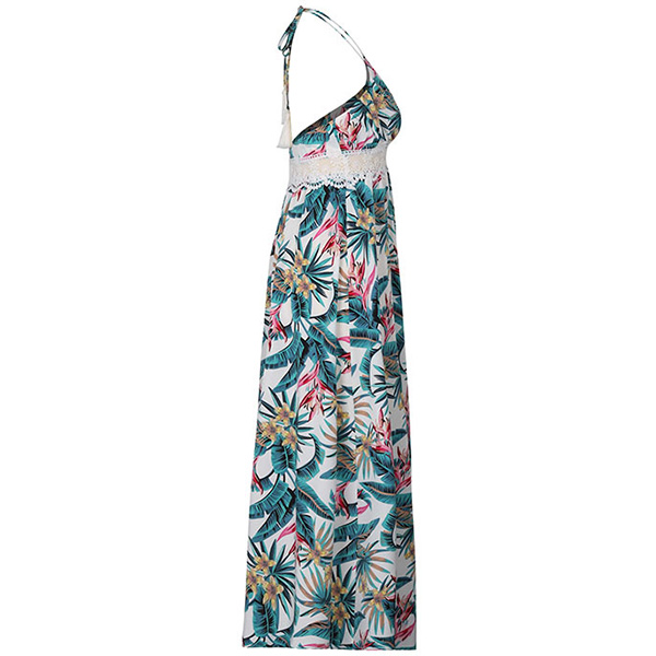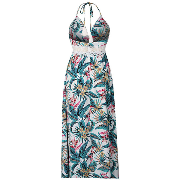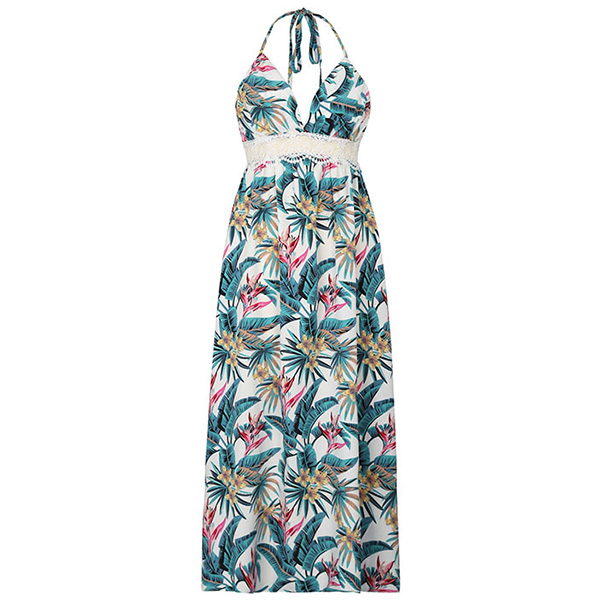 Fresh Style Floral Printed Halterneck Lace Spliced Backless Midi Dress
