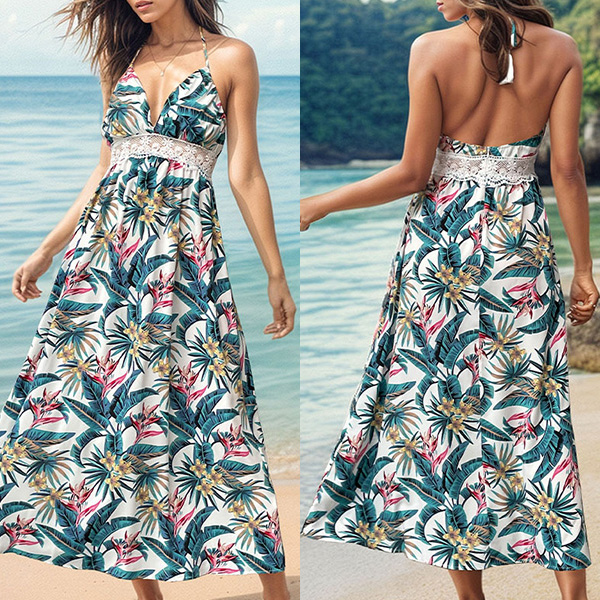 This midi dress embodies a delightful combination of floral prints, a halter neck design, lace detailing at the waist and a backless feature, sexy and femininity.