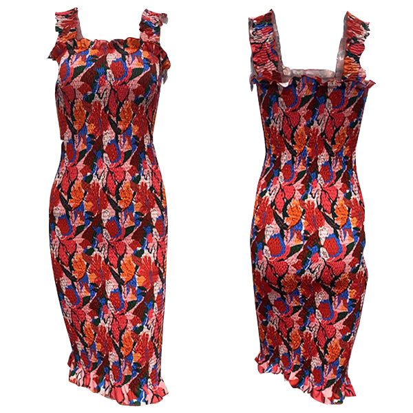 This charming dress features a square neckline, a body-hugging silhouette, and a vibrant floral print.