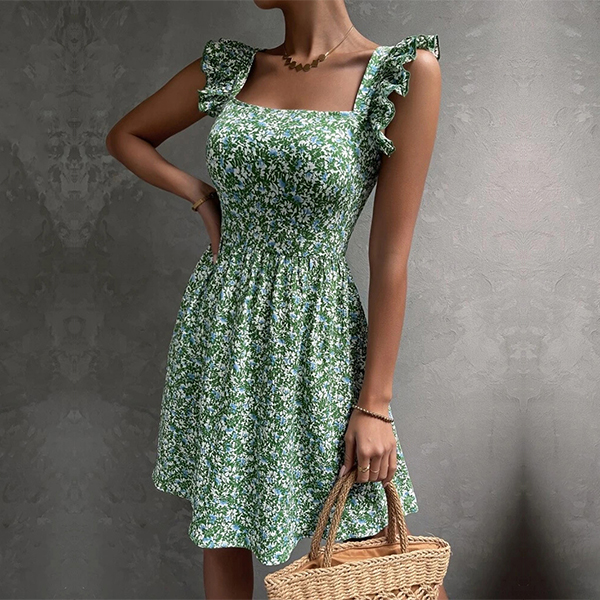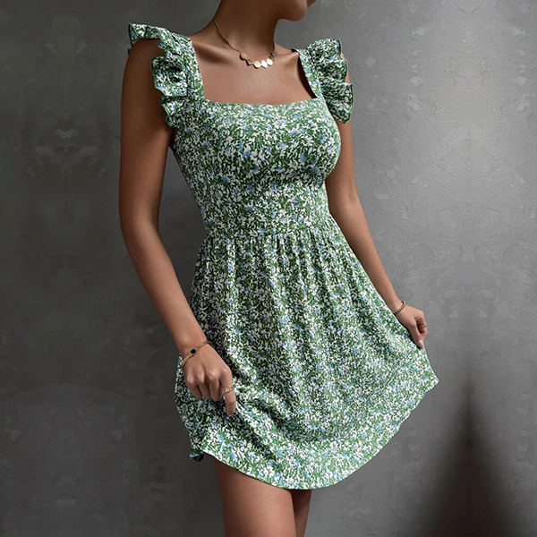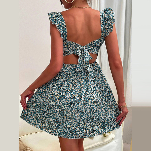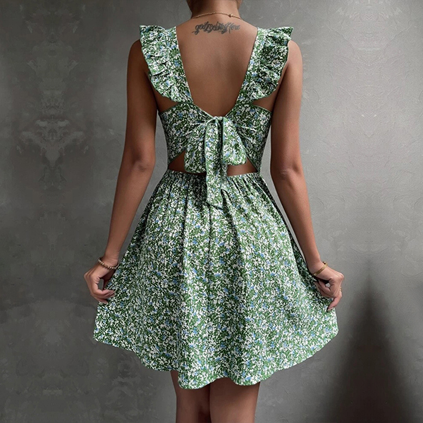 Fresh Style Floral Printed Square Neck Ruffled Sleeveless Backless Bowknot Mini Dress