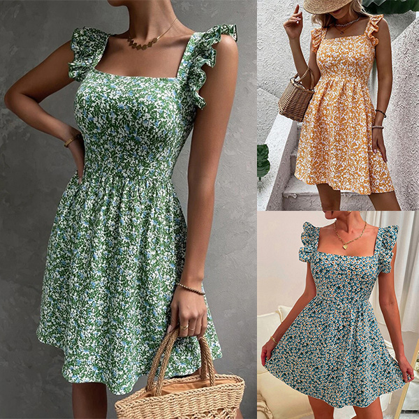 This is a charming and feminine mini dress that combines overall floral printed, a square neckline, sleeveless with ruffle details, backless detail with a bowknot accent for a fresh and stylish look.