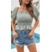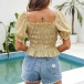 This crop top features a square neckline and short sleeves, creating a chic and feminine style. The floral print adds a touch of elegance and brings a vibrant and youthful vibe to your outfit. The smocked detailing ensures a comfortable and flattering fit that accentuates your shape. Pair this crop top with high-waisted jeans, skirts, or shorts for a stylish and effortless ensemble.