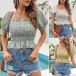 Fresh Style Floral Printed Square Neck Short Sleeve Smocked Crop Top