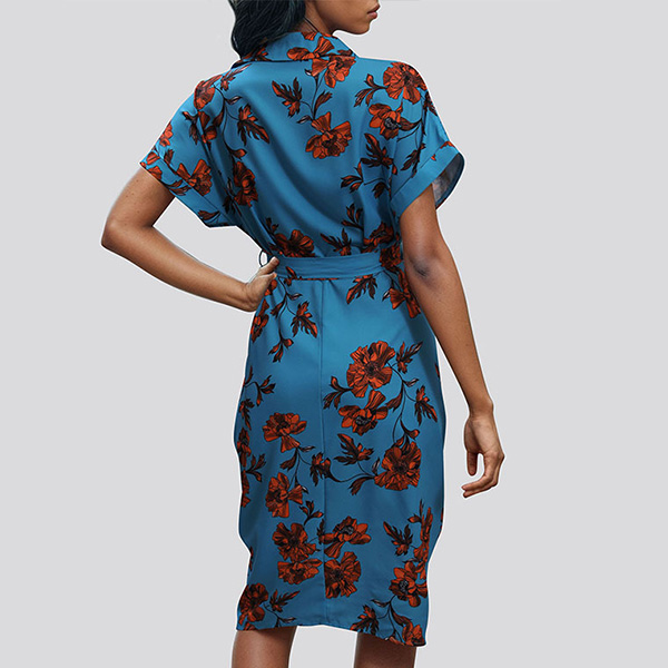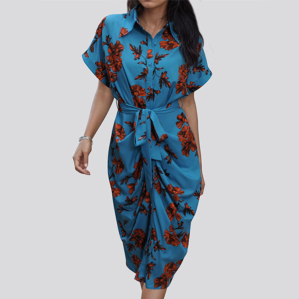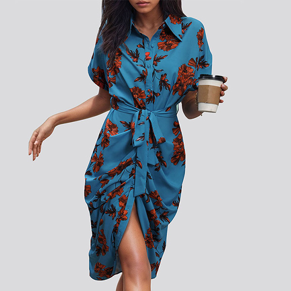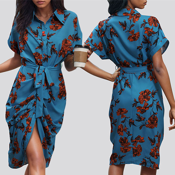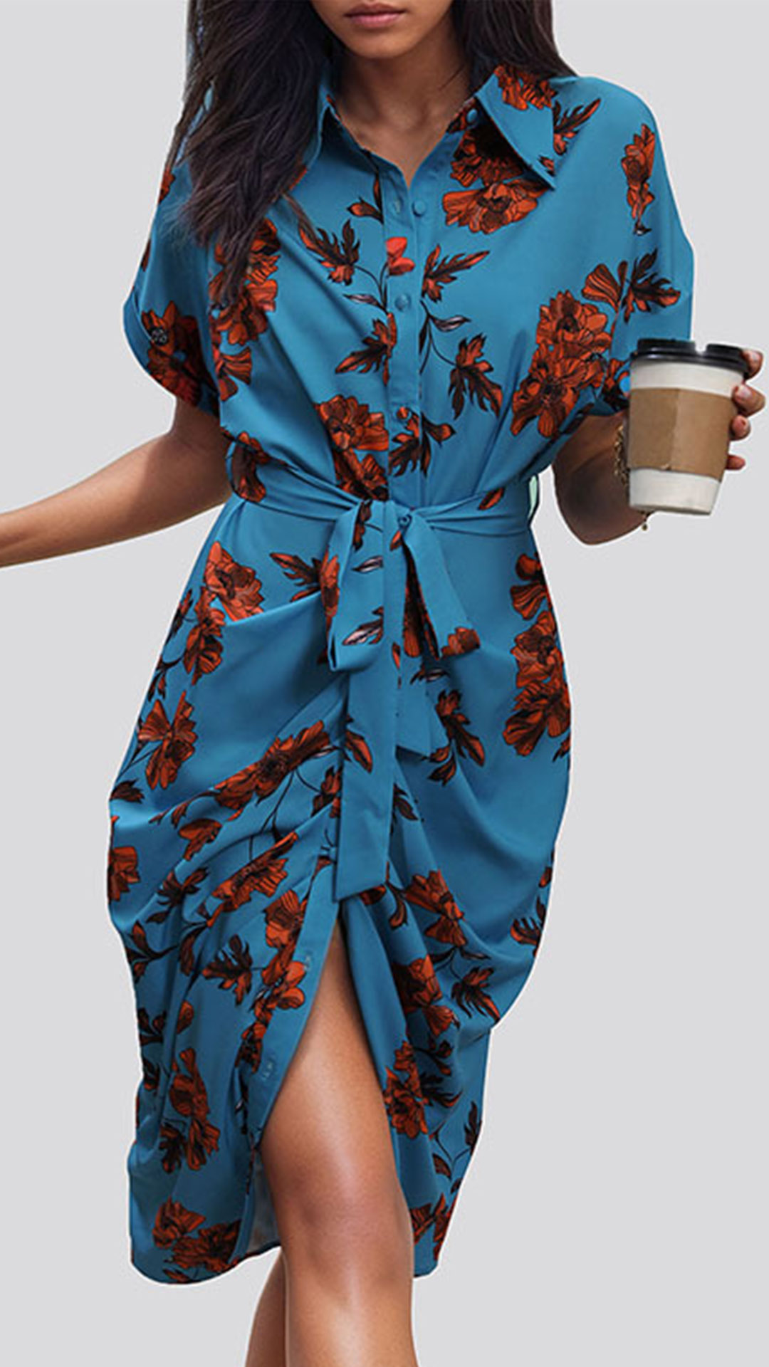This is a chic and versatile shirt dress that combines a floral print, stand collar, short sleeves, button slits, and a self-tie waist for a fashionable and modern look.