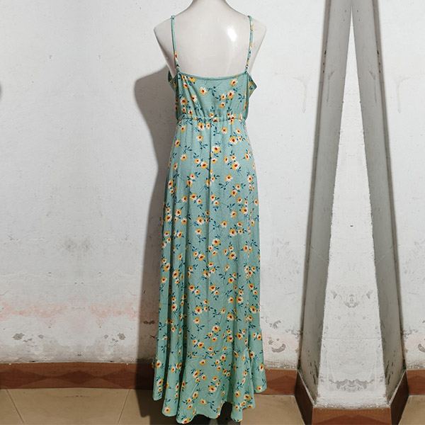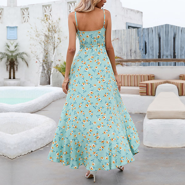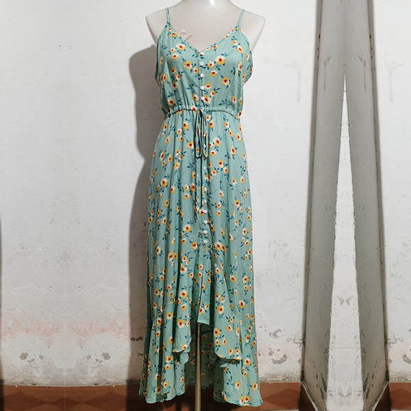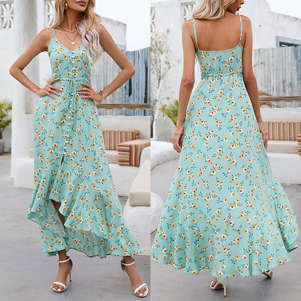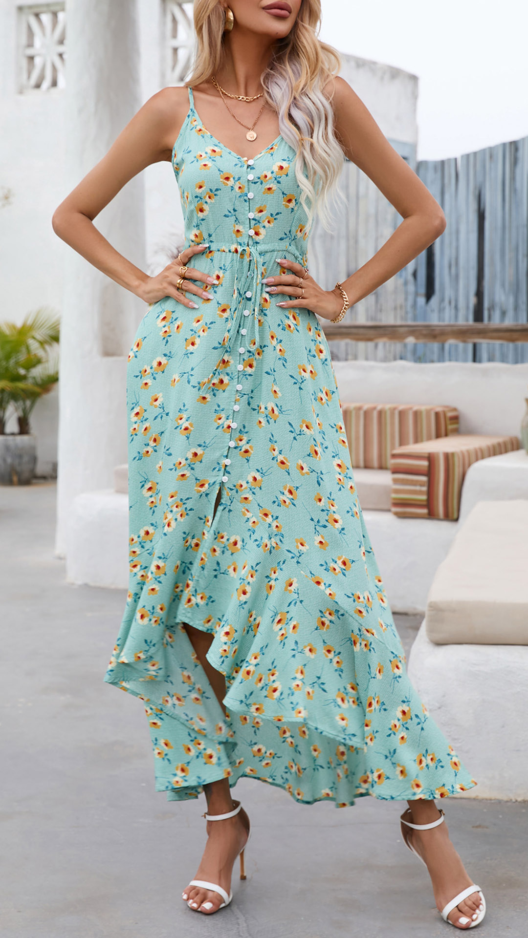 Featuring a delightful floral print, a flattering V-neckline, a drawstring waist, and an eye-catching irregular ruffle hemline, this dress creats a charming and stylish ensemble that is perfect for both casual and dressier occasions.