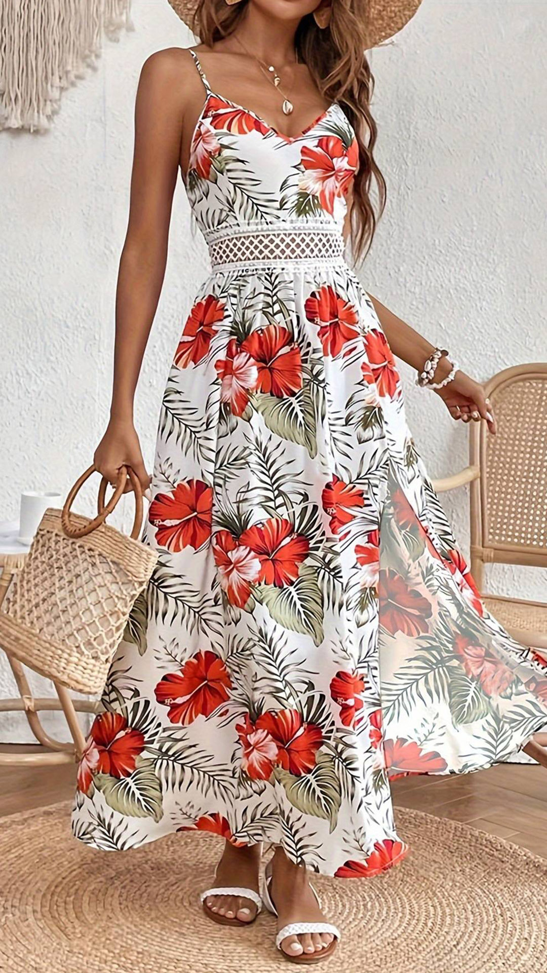 This maxi dress features vibrant, botanical-inspired floral print, lace spliced along the waist and slit design. Pair it with sandals and a denim jacket for a laid-back.