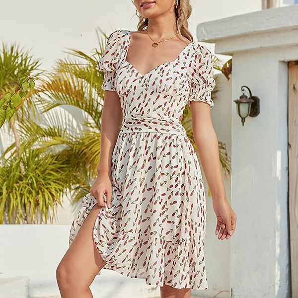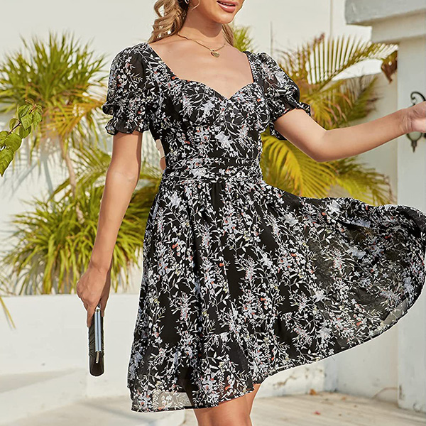 Fresh Style Floral Printed V-neck Puff Short Sleeve Criss-cross Backless Mini Dress