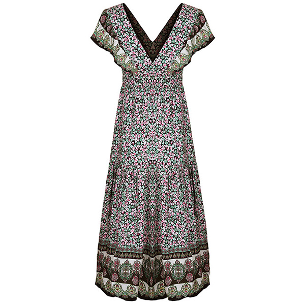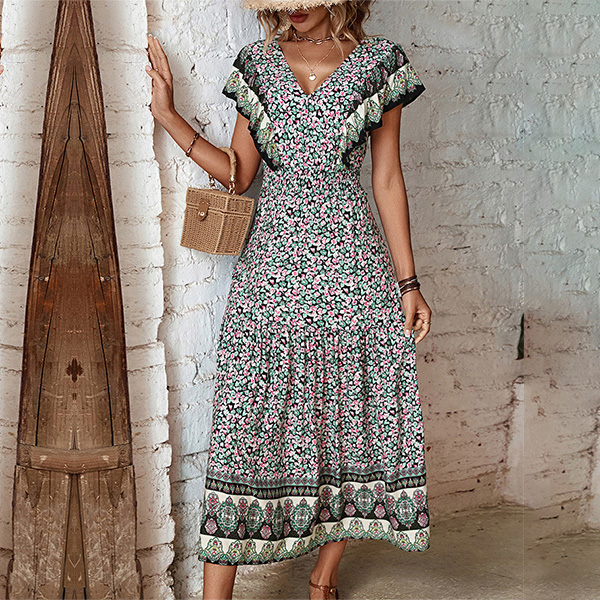 Fresh Style Floral Printed V-neck Ruffled Short Sleeve Backless Midi Dress
