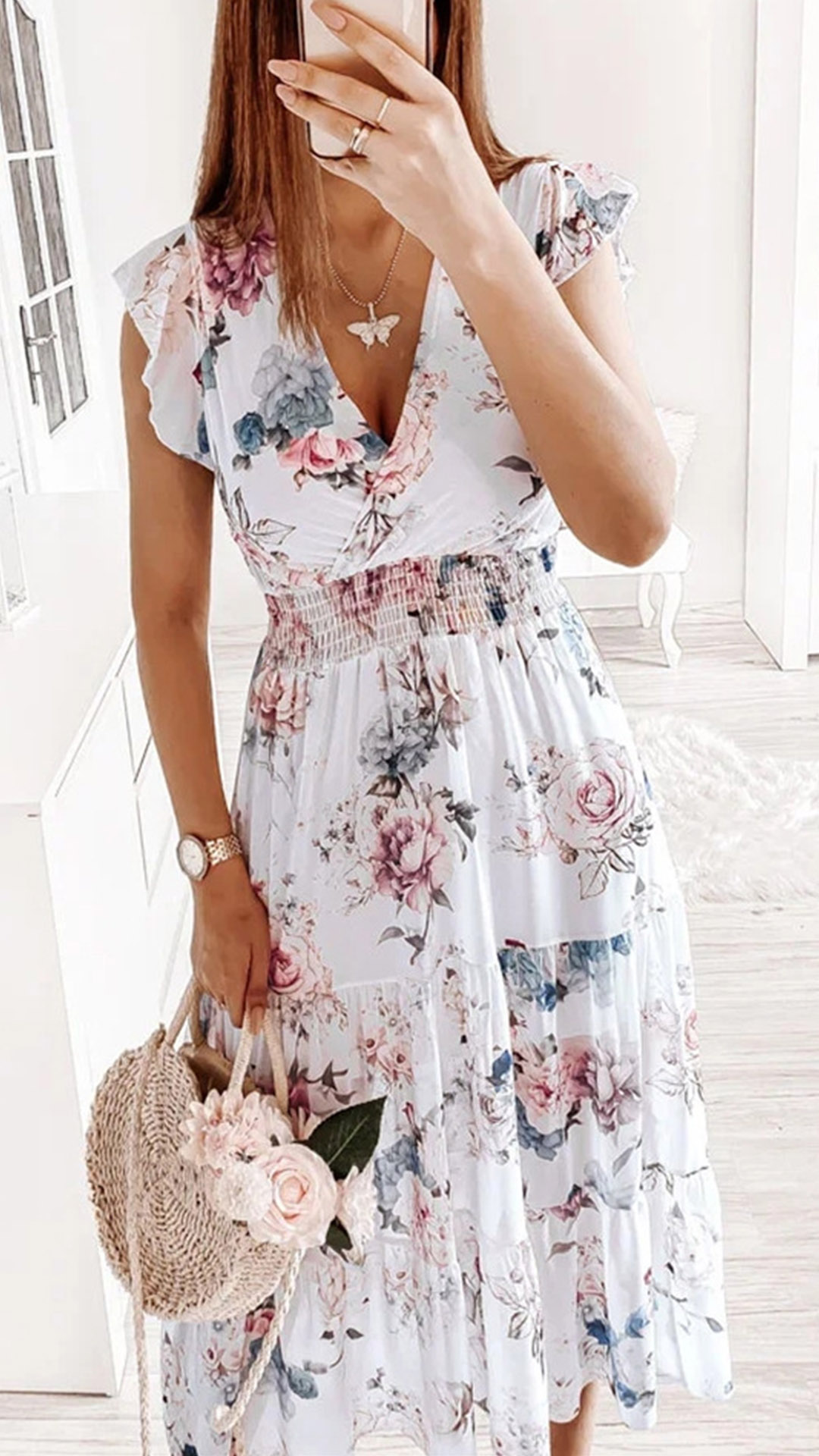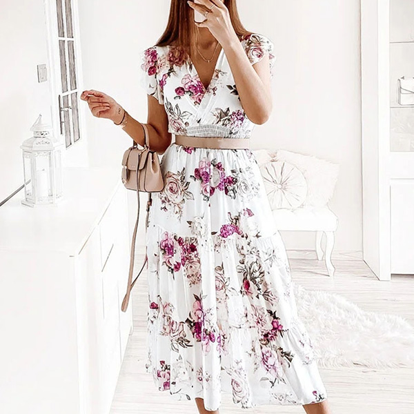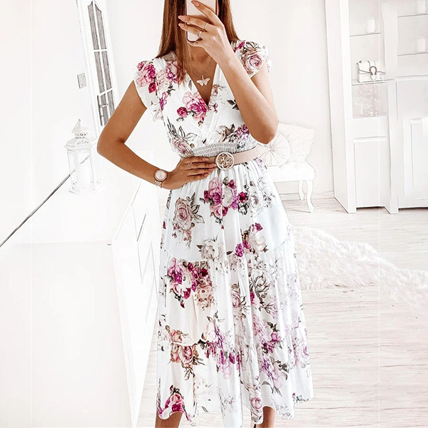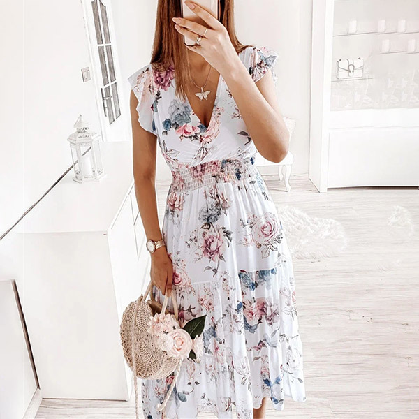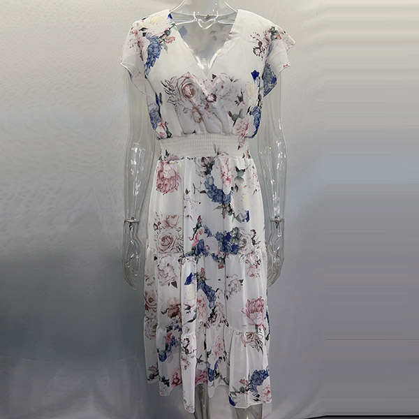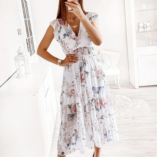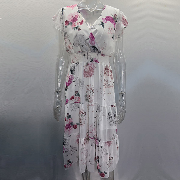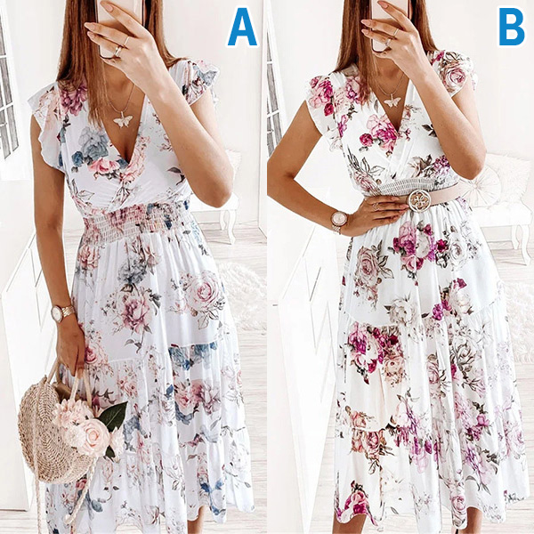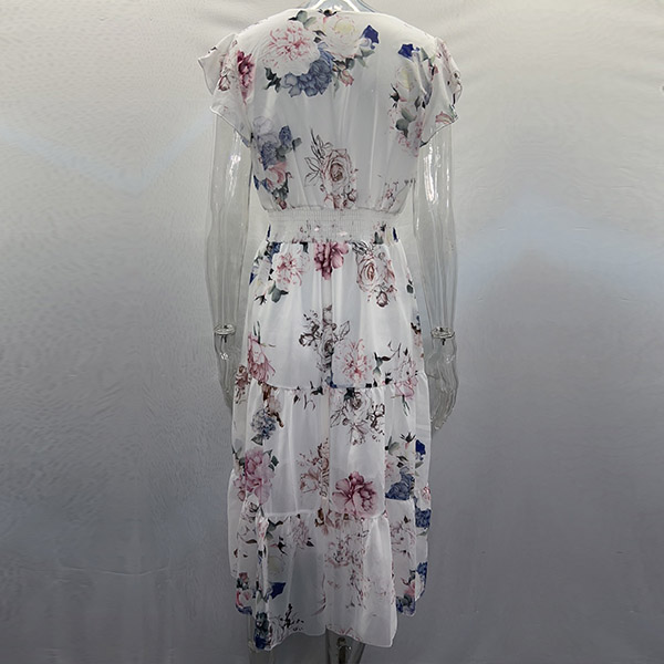 Cette robe présente un imprimé floral vibrant qui ajoute une touche de couleur et de fantaisie à l'ensemble. Le décolleté en V et les manches volantées créent une silhouette délicate et féminine, tandis que la taille smockée et la jupe à volants offrent une coupe flatteuse et confortable. Un choix parfait pour l'été !