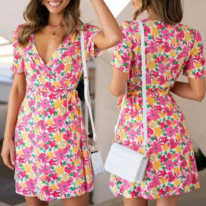 Fresh Style Floral Printed V-neck Short Sleeve Wrap Dress