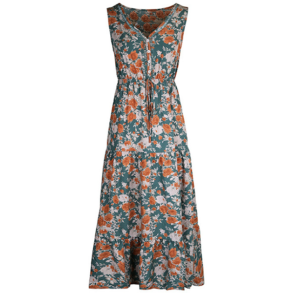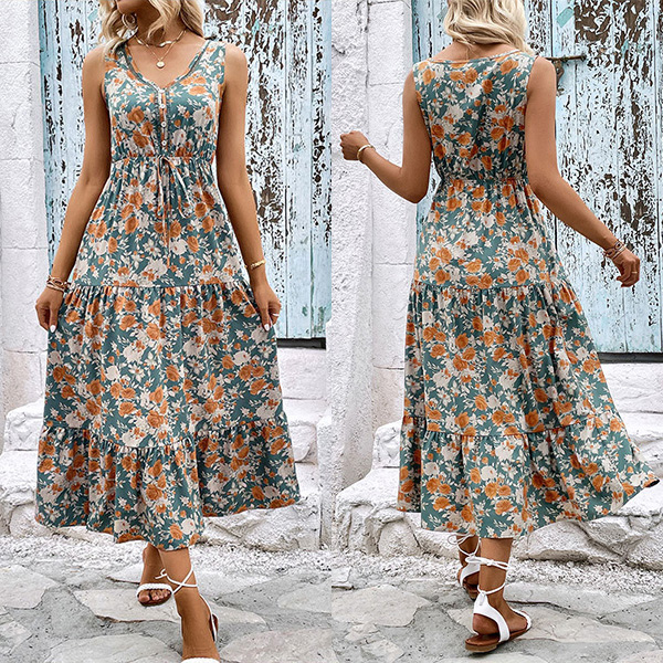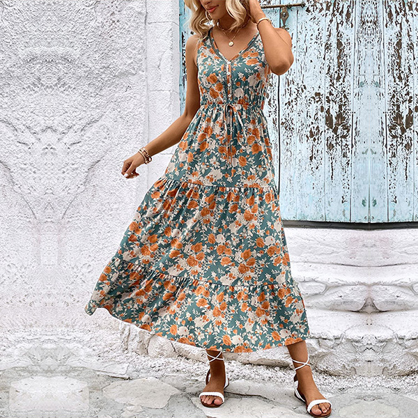 Fresh Style Floral Printed V-neck Sleeveless Midi Dress